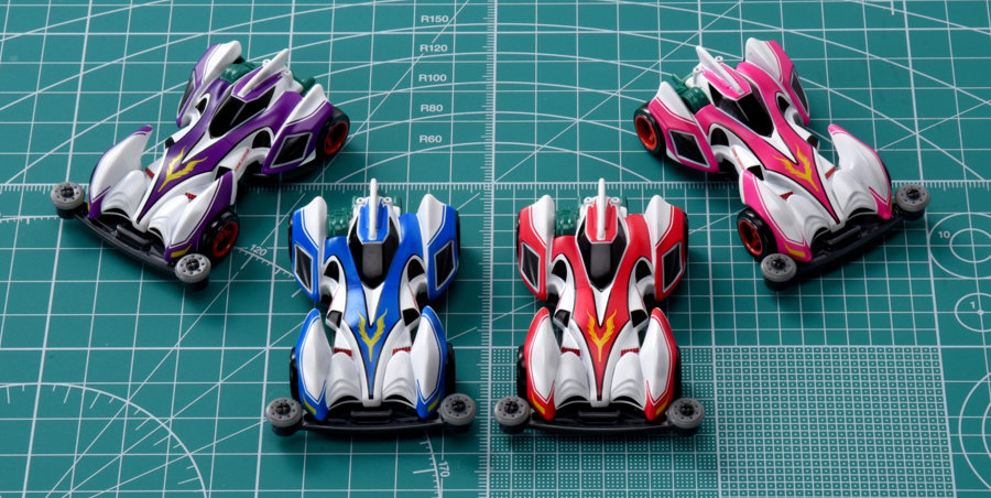 この3色は1966年発売のスーパーファミコ用ゲーム「ミニ四駆 シャイニングスコーピオン レッツ&ゴー!!」のプレイヤー熟練度が上がるにつれて、マシンが青→紫→ピンク→赤に変わるゲーム演出を再現している模様です。