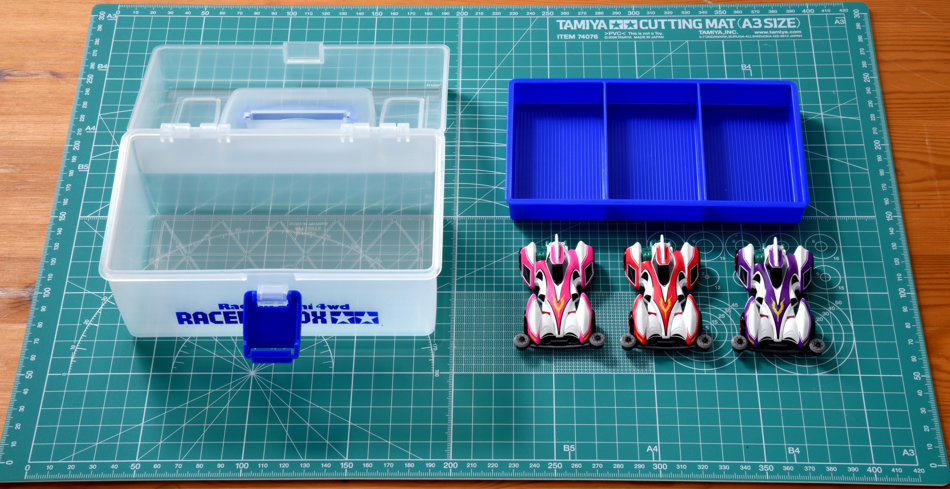 尚、レーサーズボックスのサイズは公表されていませんが、タミヤカッティングマットから察するにボックスの底面は約16cm(横) x 約8cm(縦)の模様です。
